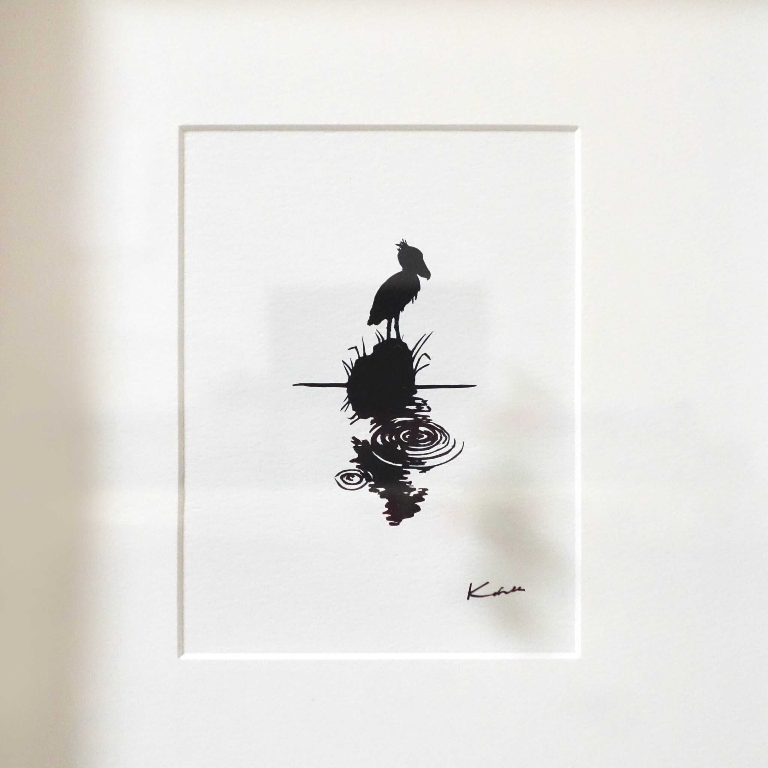 アフリカの湿地帯に生息する鳥「ハシビロコウ」 水の中を静かに見つめている姿を描きました。